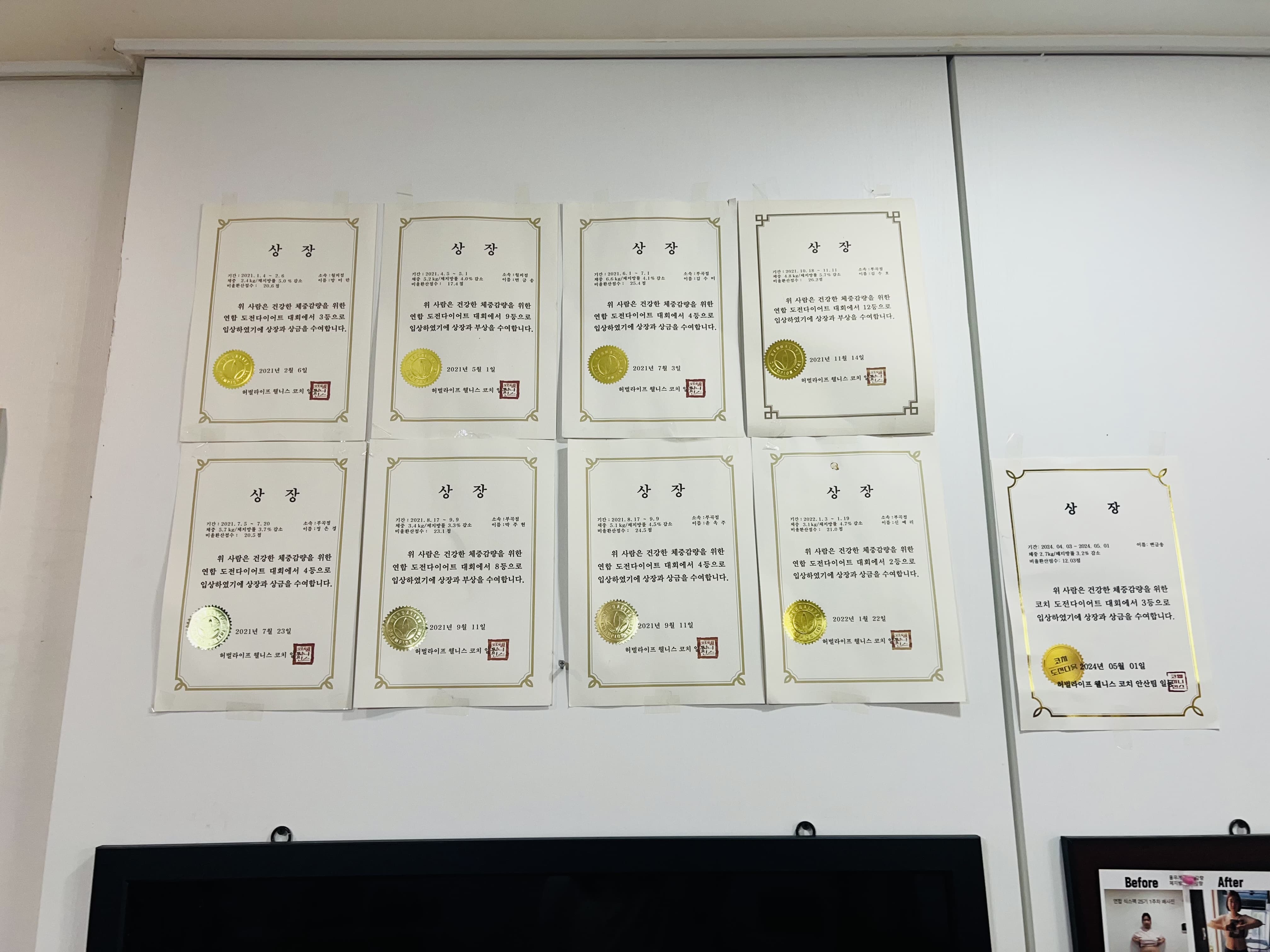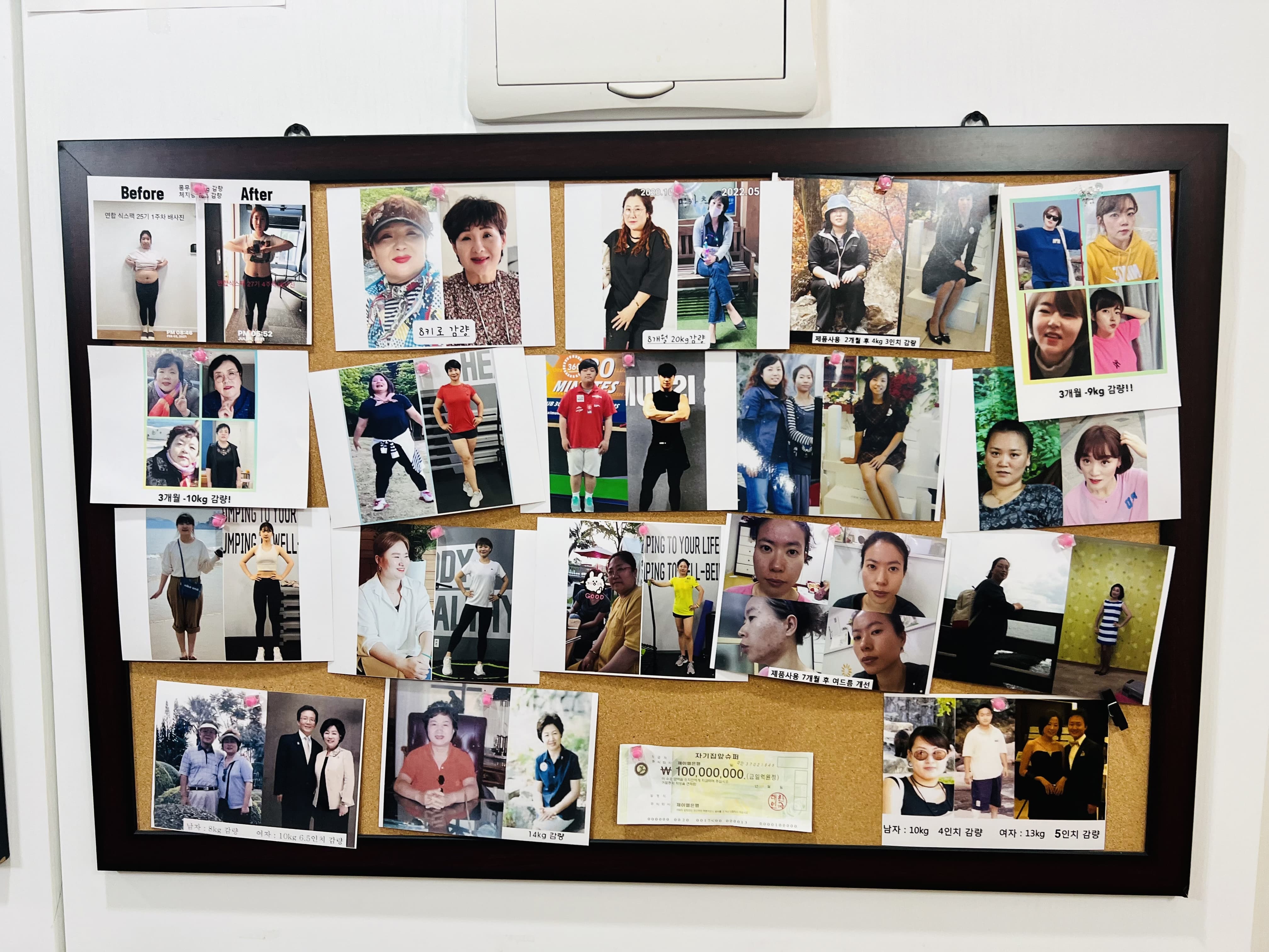 가게 한쪽 벽에는 -10kg, -9kg 감량 후기 사진이 빼곡하게 붙어 있어요.