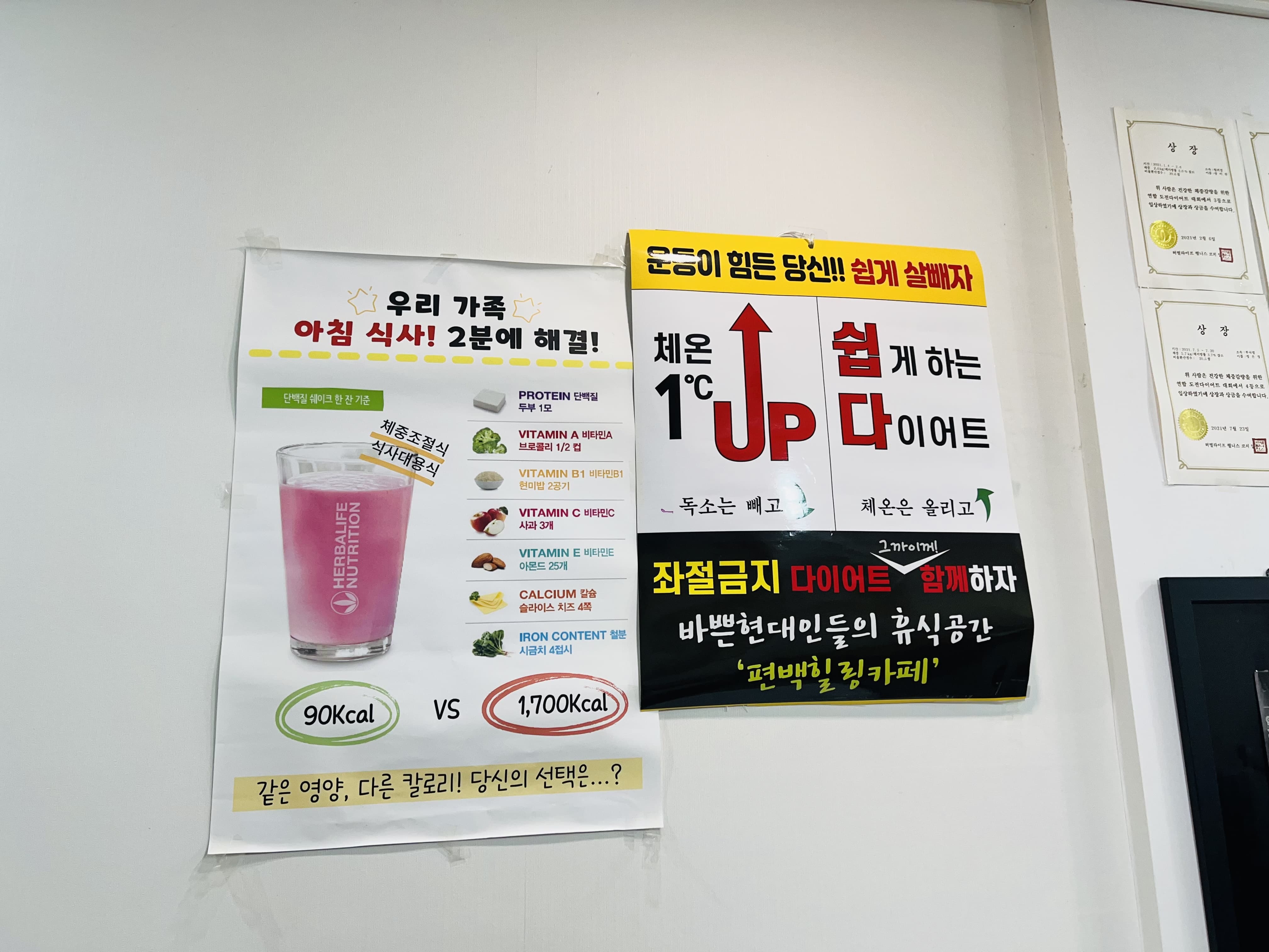 - 가게 벽에도 “아침식사 2분 해결” 쉐이크 포스터가 붙어 있어서, 다이어트 관심 있는 분들 많이 드시더라고요.