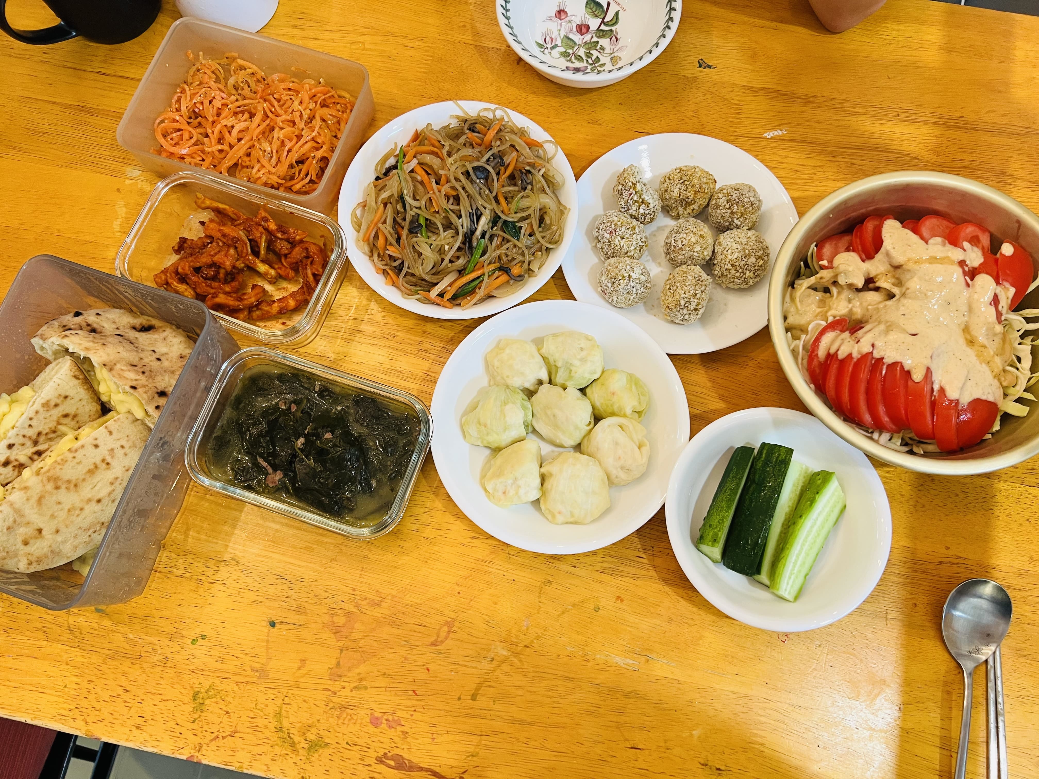 쫄깃한 잡채, 토마토 샐러드(+시그니처 소스), 단호박찜, 김치, 미역국까지!