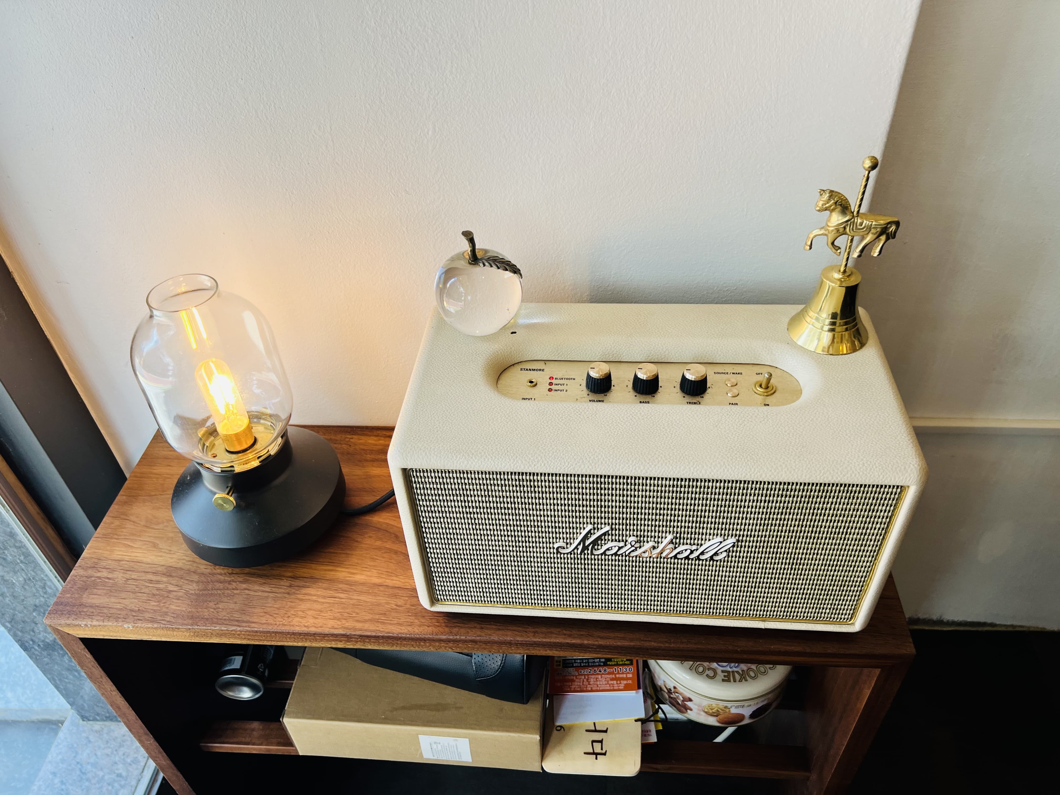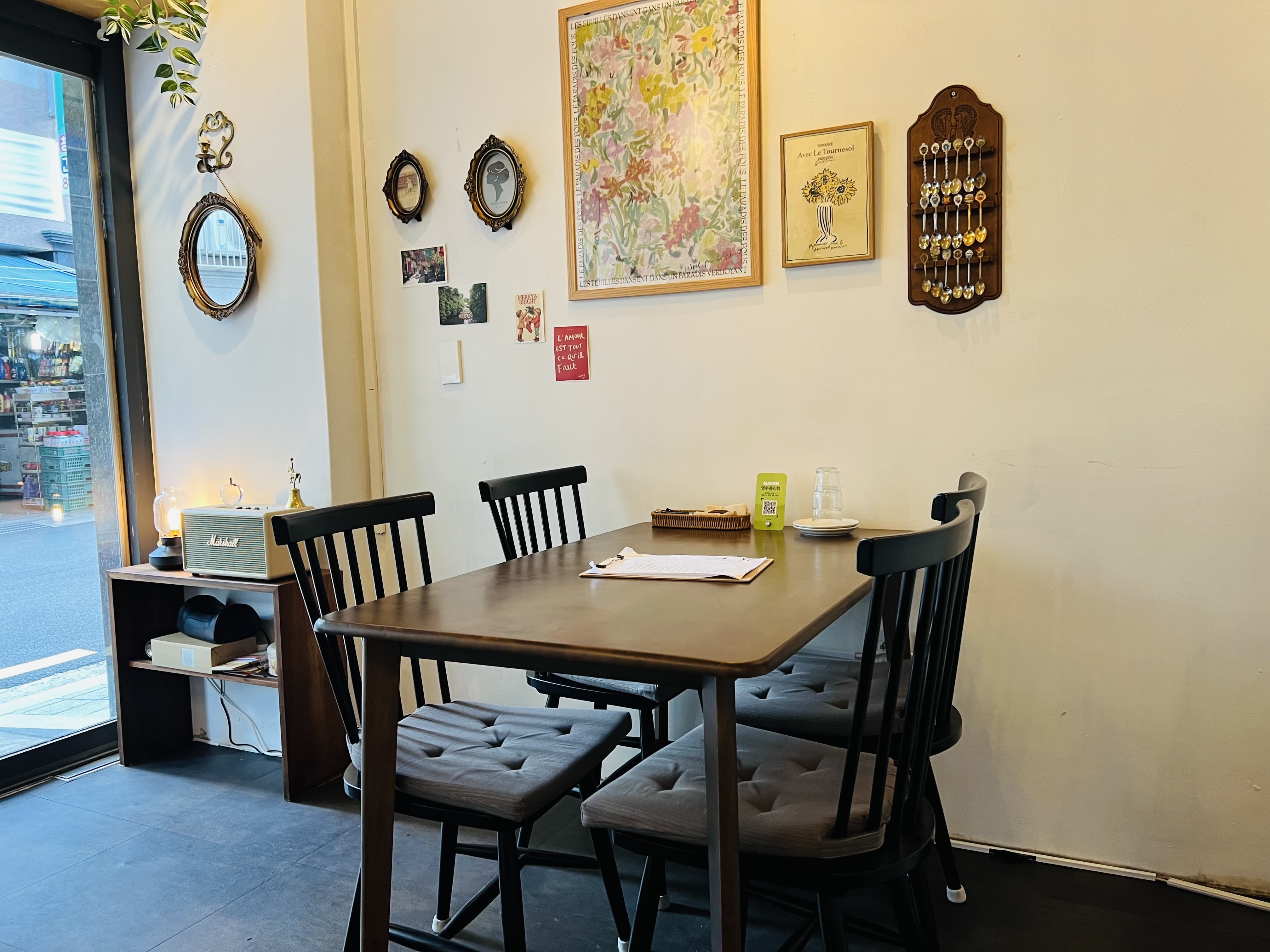 벽에는 액자랑 그림, 엽서들이 자연스럽게 걸려 있고, 구석에는 마샬 스피커와 빈티지 램프가 포인트로 자리잡고 있어요.