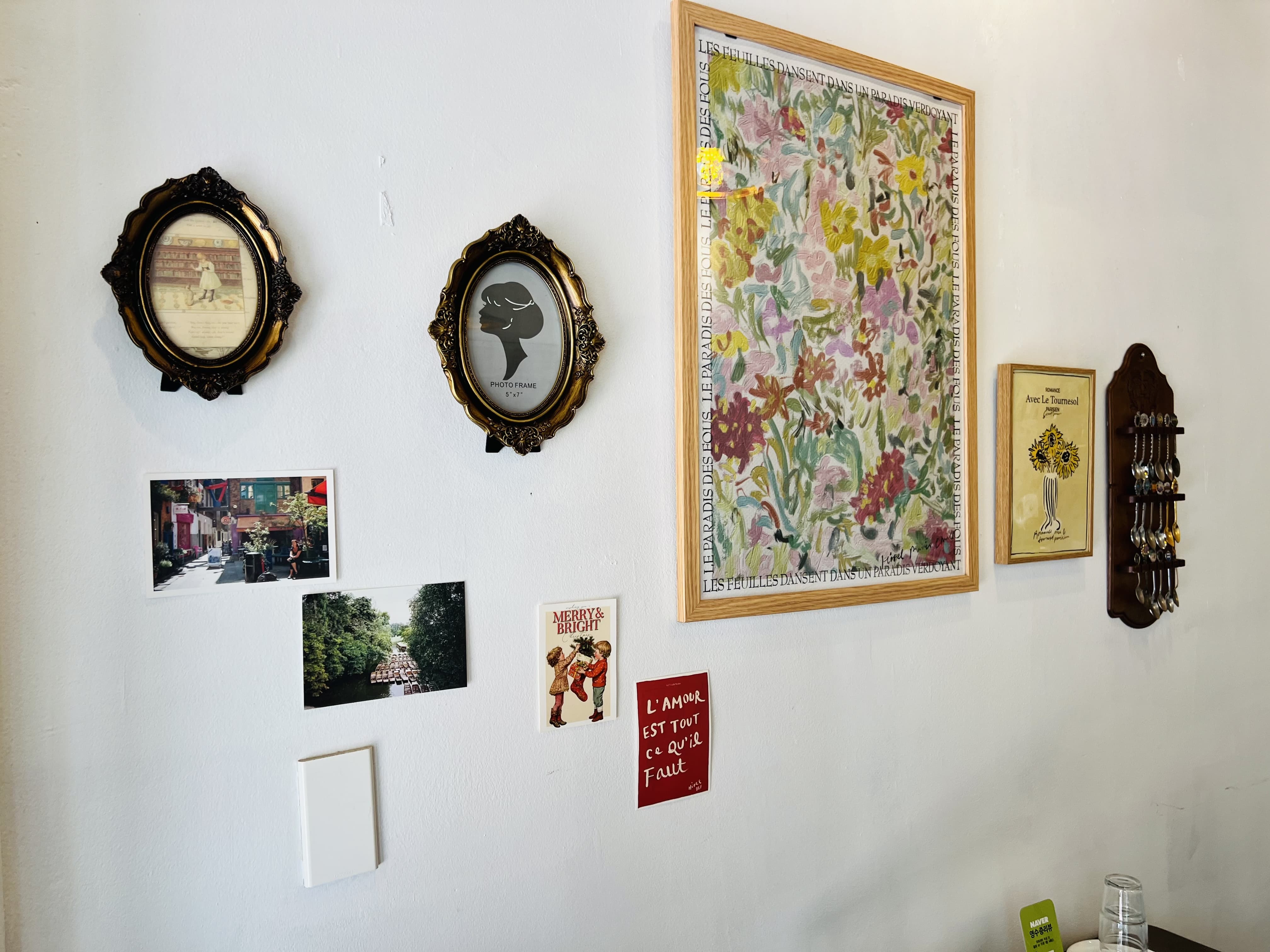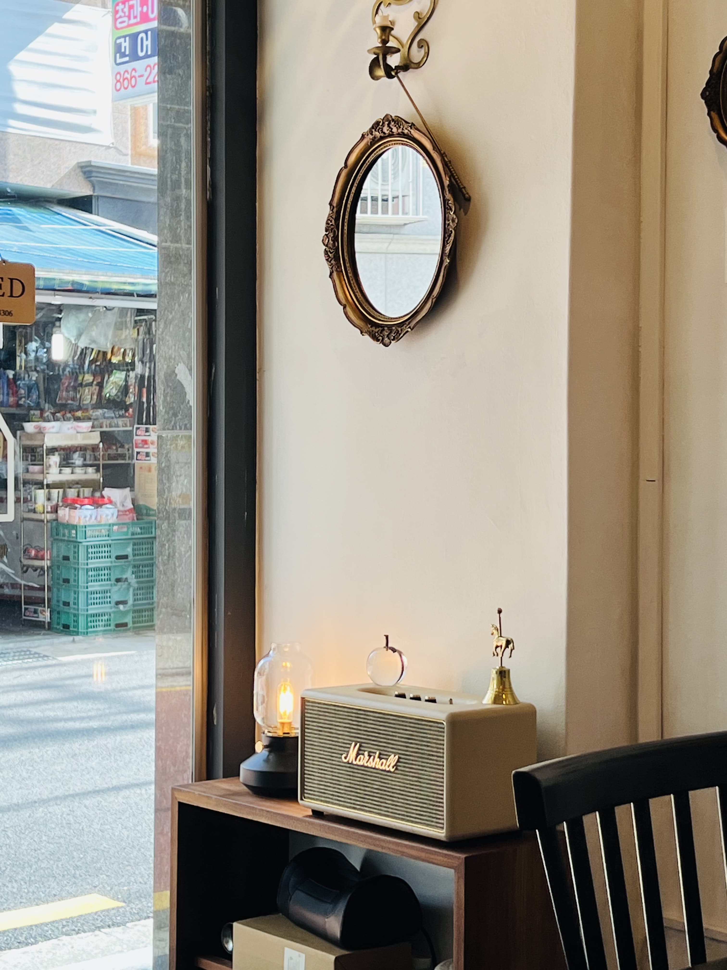 벽에는 액자랑 그림, 엽서들이 자연스럽게 걸려 있고, 구석에는 마샬 스피커와 빈티지 램프가 포인트로 자리잡고 있어요.