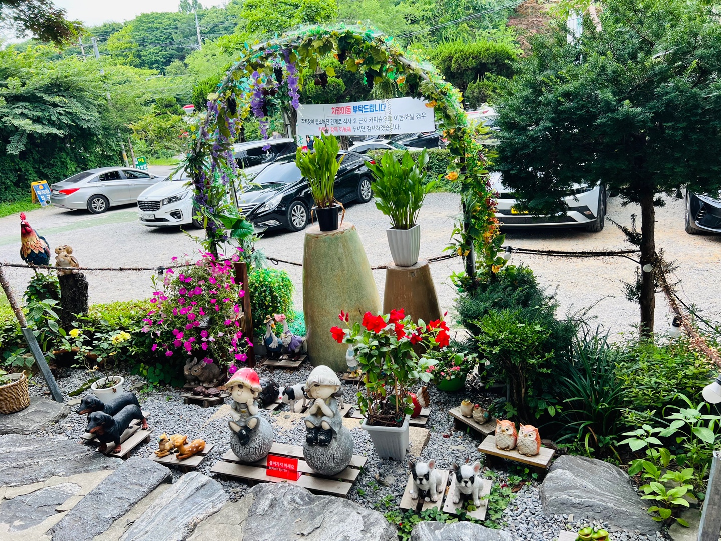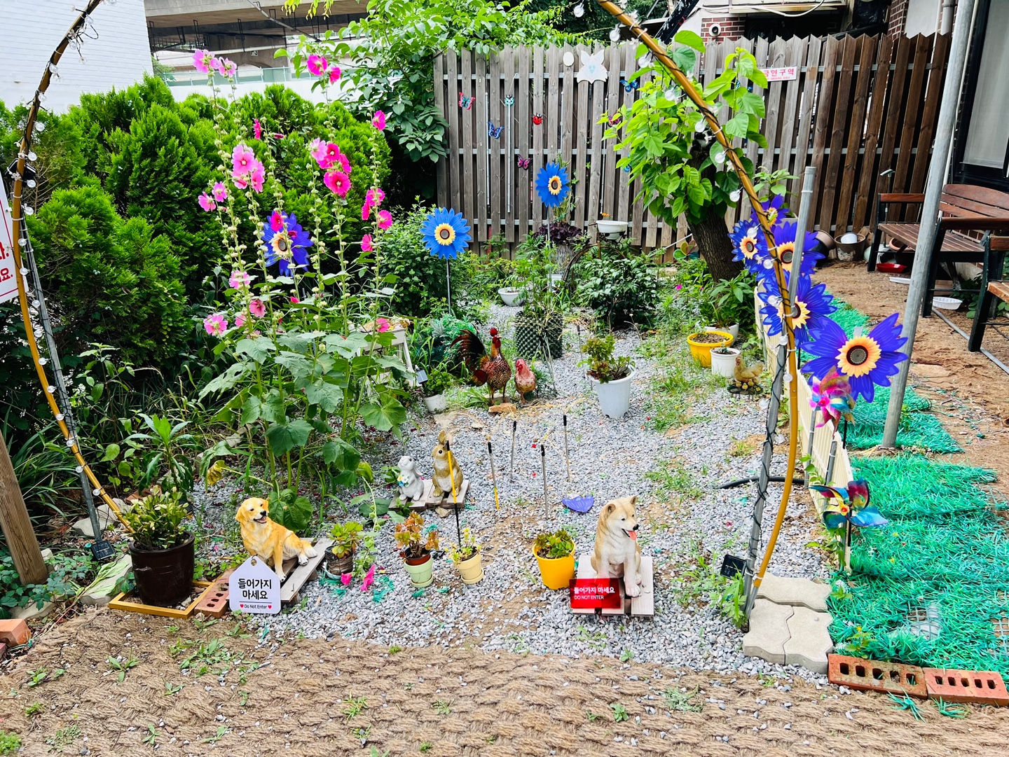 정원 한켠에는 ‘들어가지 마세요’ 팻말이 붙은 귀여운 강아지·동물 모형들과 꽃장식이 가득!