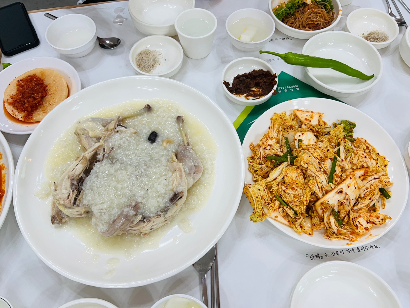 🌿 누룽지백숙은 진득하고 구수한 맛, 겉절이와 막국수가 조화롭게 잘 어울림.