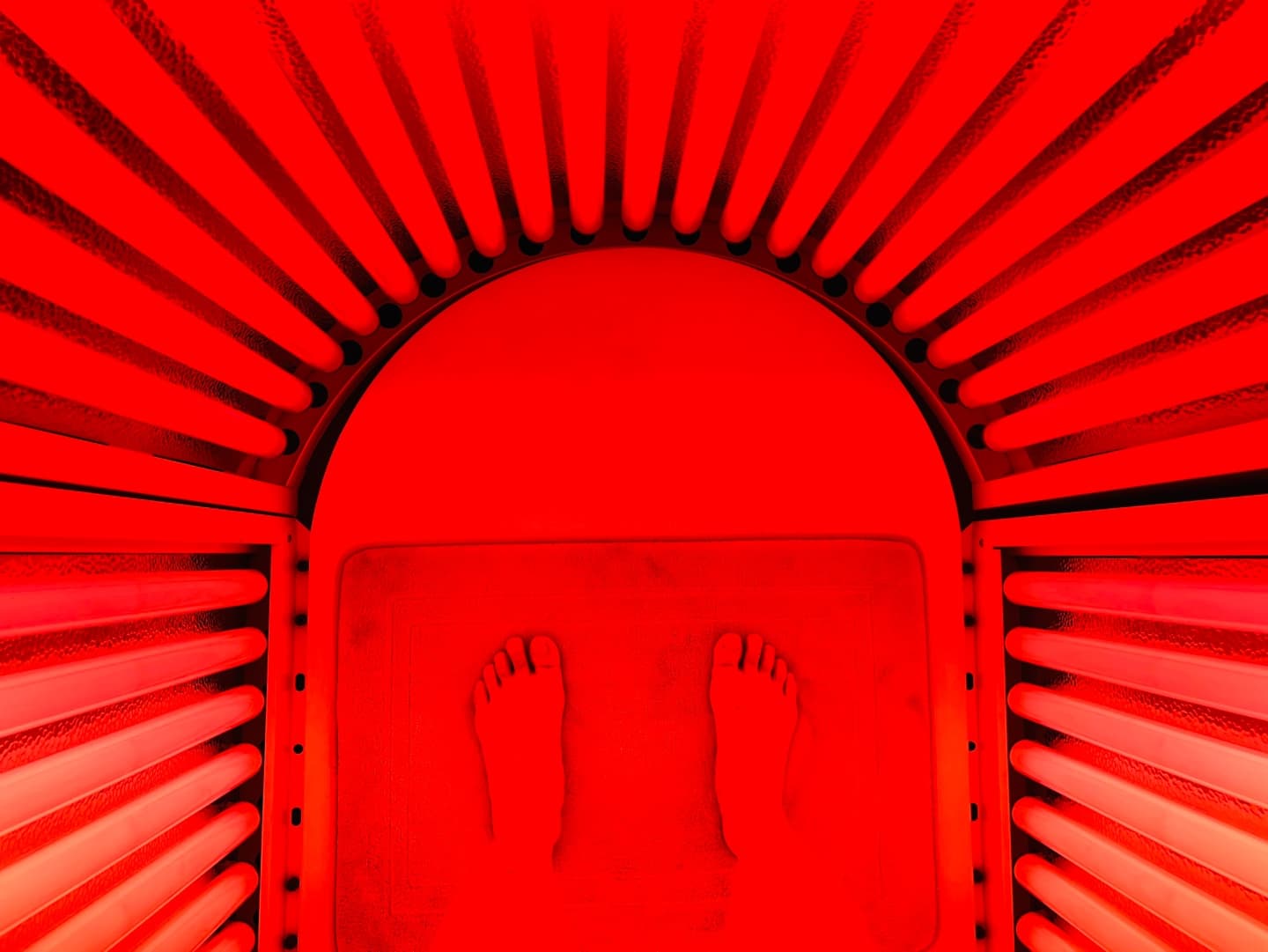 화이트태닝 기계는 전체 내부가 **적색광(600~700nm)**으로 빛나는데요,