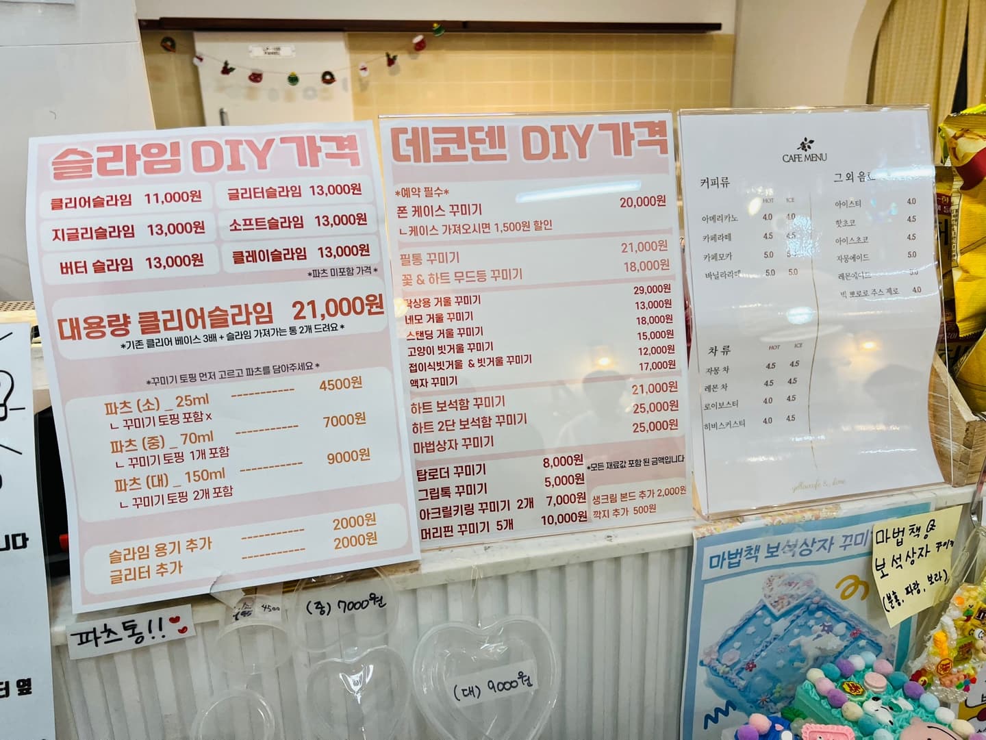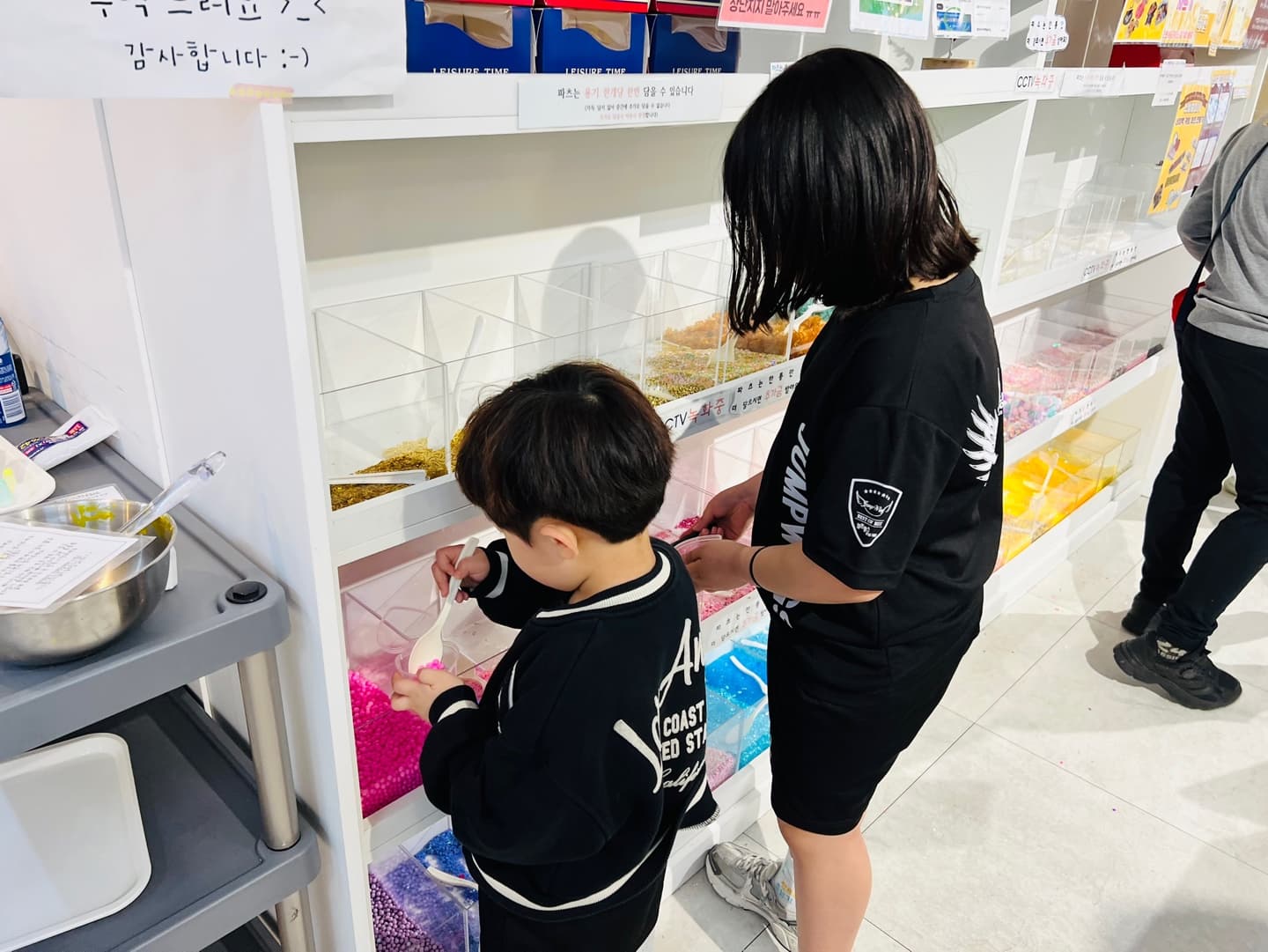 - 아이들이 직접 테스트 슬라임을 만져보고 원하는 슬라임 하나씩 고르고 어른은 입장료 대신 음료를 한잔 시키면 된다고 해서 아아를 시켰습니다.