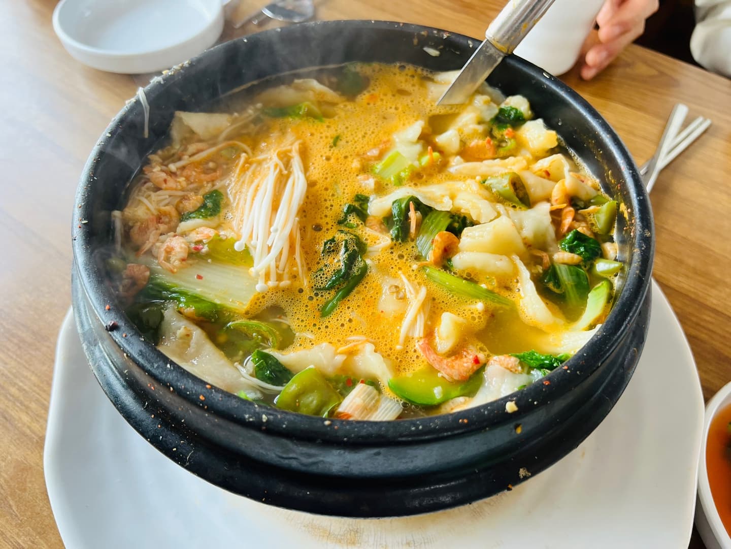 배추, 미나리, 팽이버섯, 건새우, 들깨가루까지 푸짐하게 들어간 국물요리.