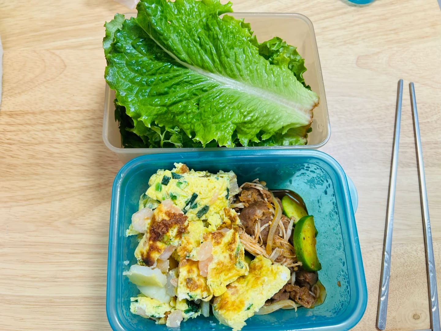 계란부침, 돼지고기채 볶음, 쌈채소!