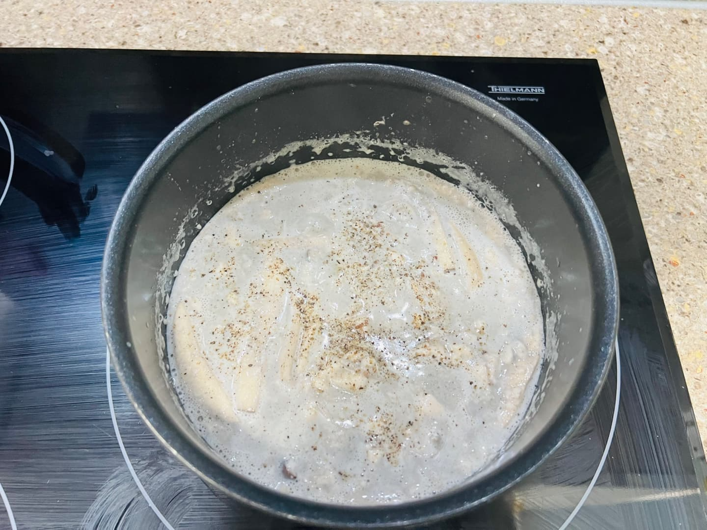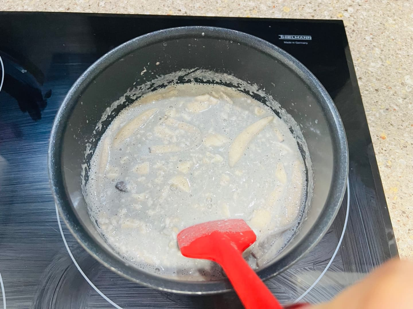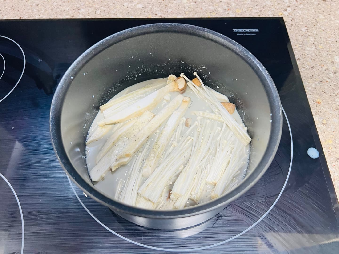 버섯을 넣고 뚜껑 없이 5분간 끓여요.