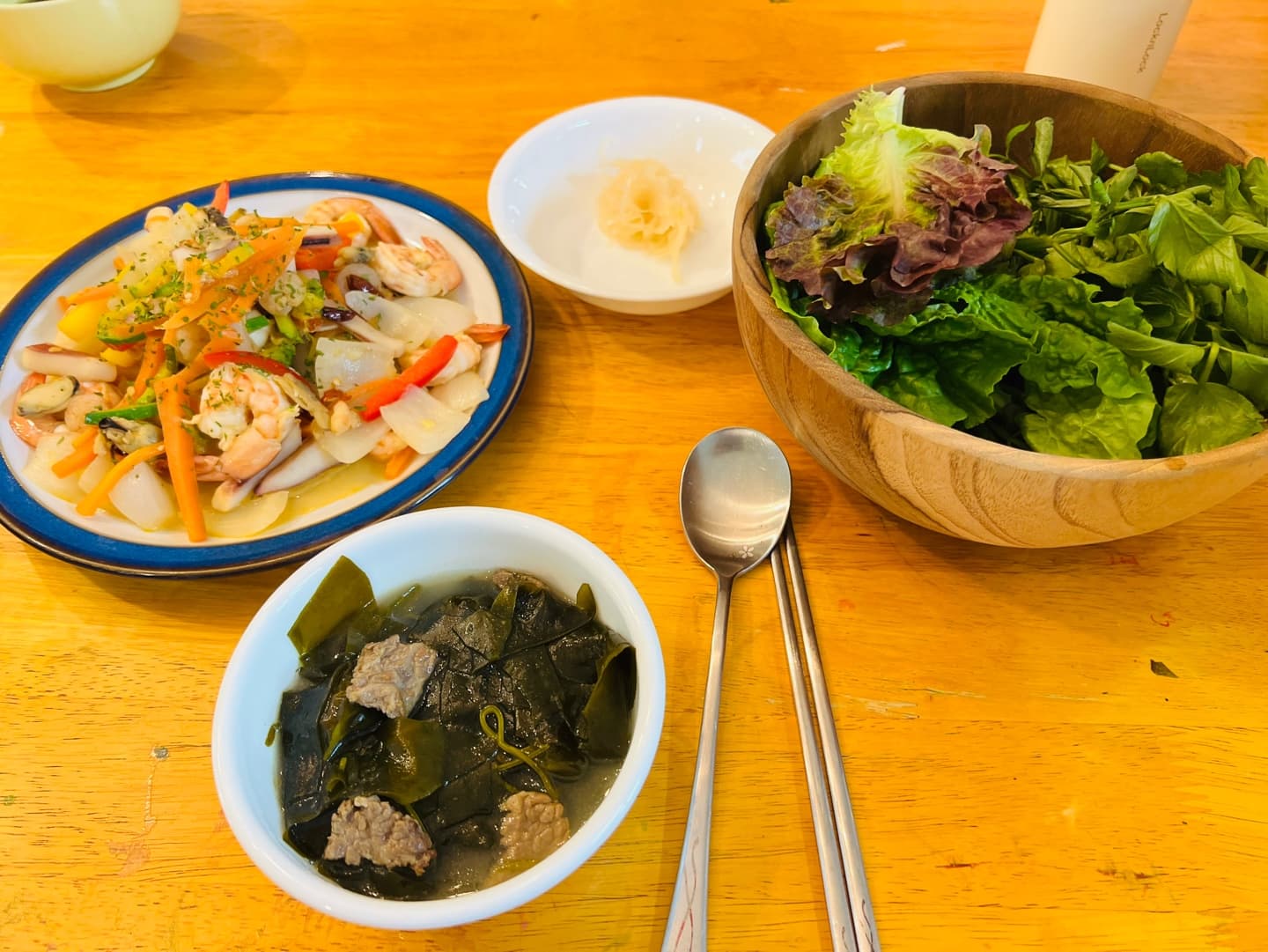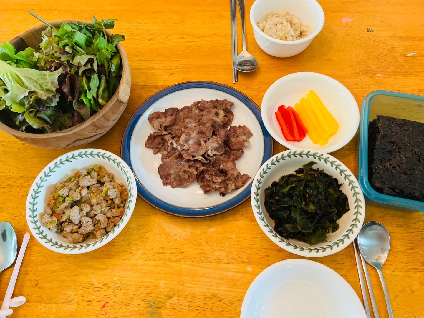 • 🥬 점심: 저염 미역국 + 소고기쌈 + 나물