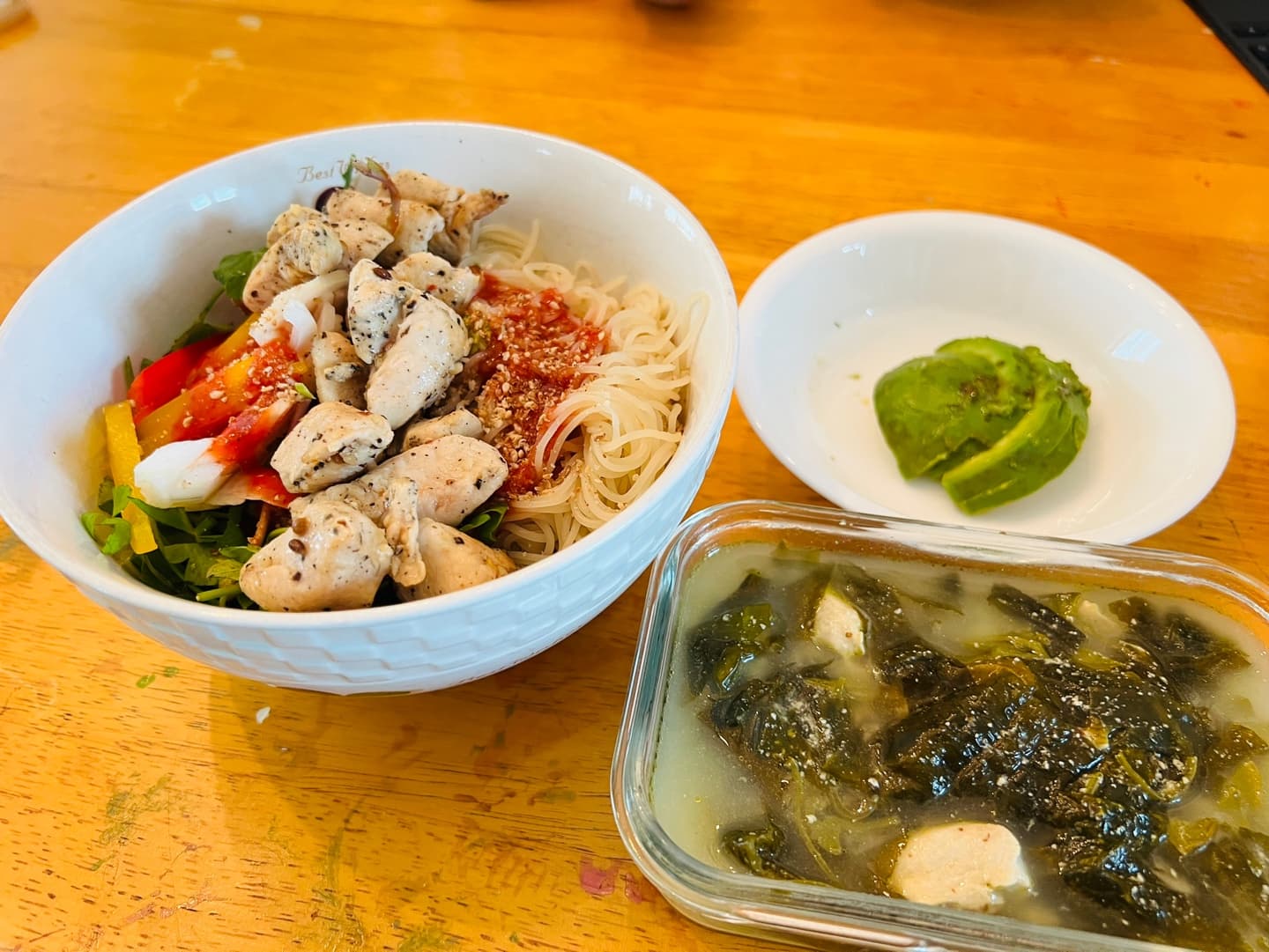 탄수화물은 소면으로, 단백질은 닭가슴살로, 지방은 아보카도에서 균형 맞춘 점심. 비빔장은 직접 만든 저당 고추장 소스 사용!
