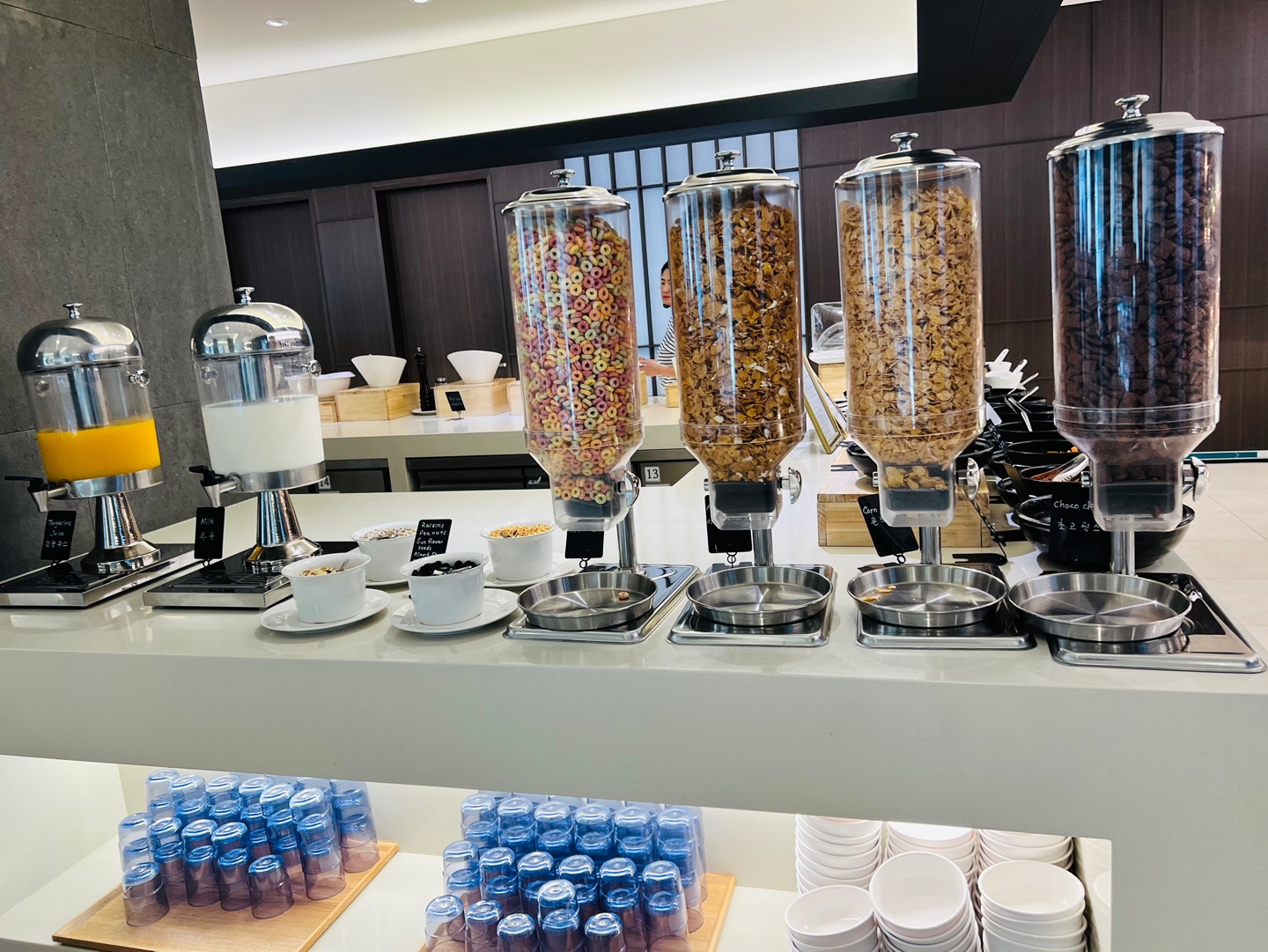 시리얼 종류가 다양해서 아이들도 좋아할 구성! 우유와 오렌지 주스도 깔끔하게 준비되어 있었고, 컵과 그릇도 넉넉하게 구비되어 있었어요.
