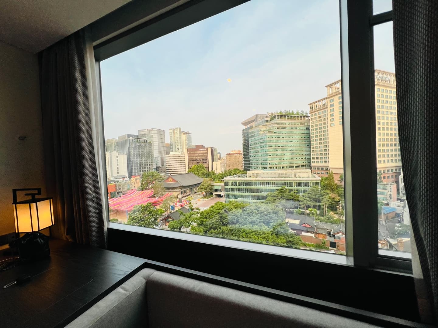 창문 너머로 보이는 풍경이 진짜 멋졌어요. 현대적인 건물들 사이로 조계사도 보이고, 한옥과 고층 빌딩이 공존하는 서울의 매력이 잘 드러나는 풍경이었답니다. 도심 속 힐링 뷰, 이 한 장면만으로도 충분히 숙박 가치 있었어요.